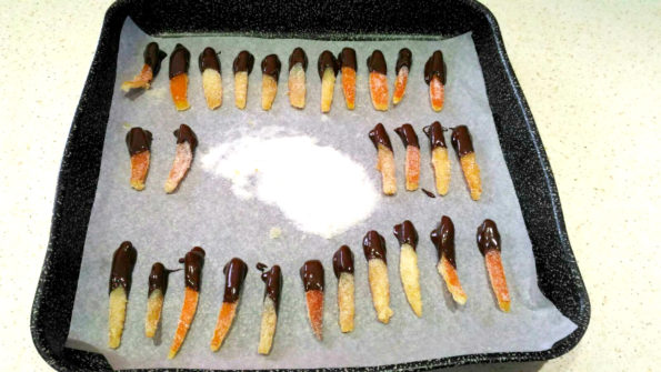 Dopo aver trovato una ricetta veloce per realizzarle, ho fatto anche la versione delle Scorzette di arance candite al cioccolato fondente.