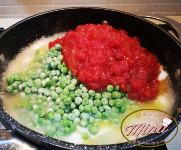 A questo punto toccherà sfumare con il vino, mi raccomando deve evaporare tutta la parte alcolica, solo dopo aggiungeremo i piselli e il pomodoro.