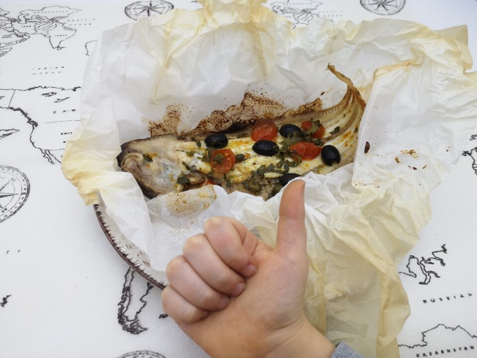 Possiamo scegliere se servire così aperto con il cartoccio oppure toglierlo e metterlo sul piatto, ma a mio avviso è molto più scenografico oltre che pratico, potrebbe succedere che si rompe durante lo spostamento.