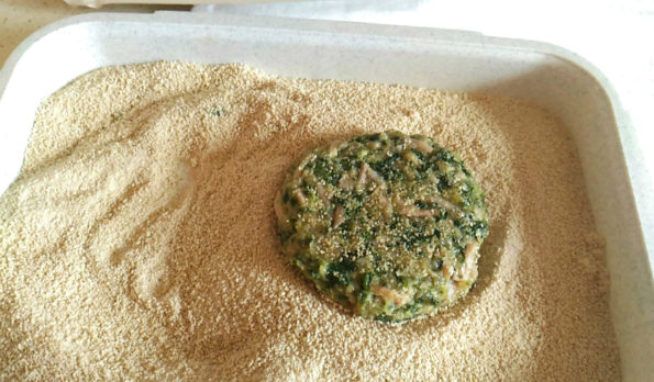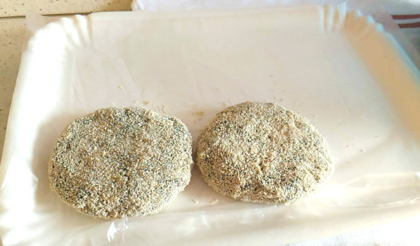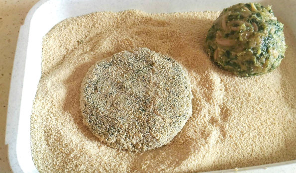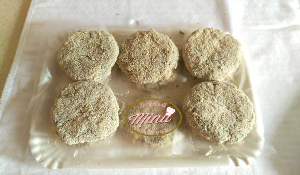 Le mie pesano circa 150 grammi cadauna, poggiamole direttamente sul pane grattugiato.
