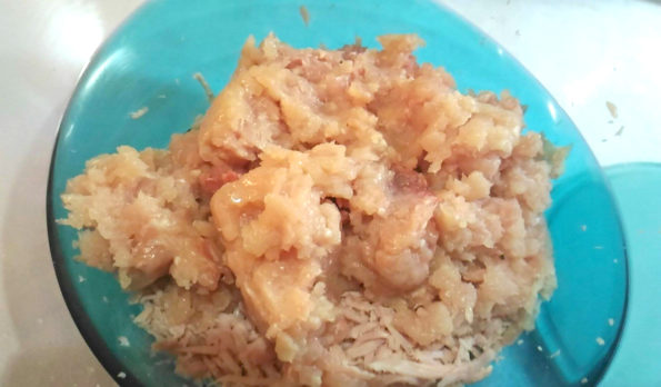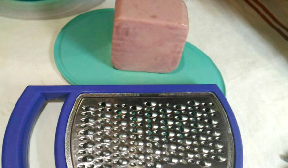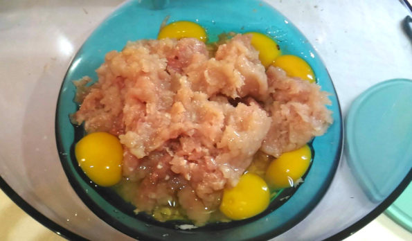 Grattugiamo grossolanamente il prosciutto cotto e lo uniamo al petto di pollo macinato.