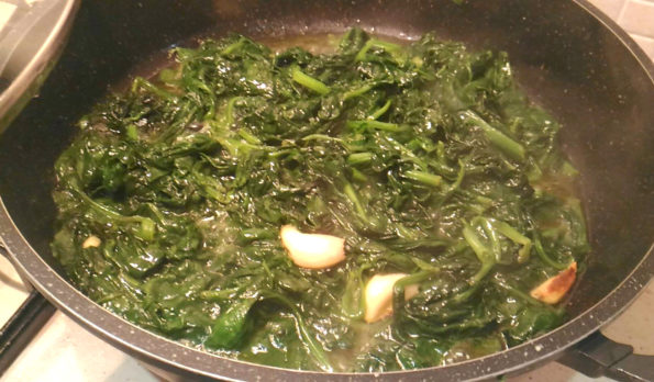 Puliamo e laviamo gli spinaci, stufiamoli con aglio e olio e un pizzico di sale.