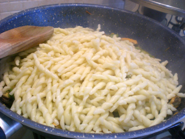 Intanto cucinate gli strozzapreti al dente scolate direttamente in pentola e saltate, facendo in modo che insaporiscano bene.