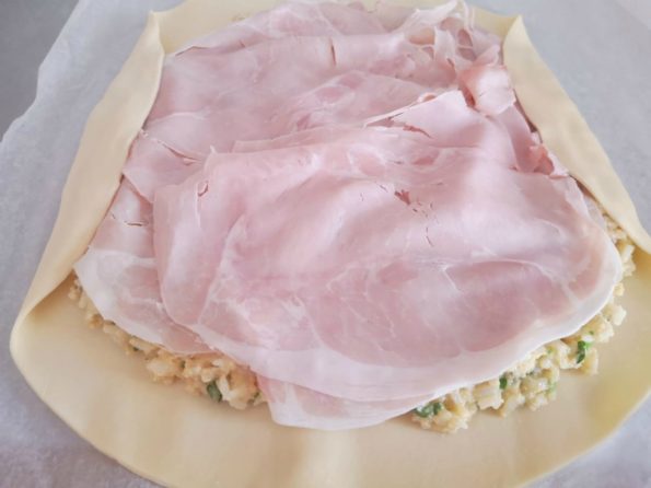 Srotolate la pasta sfoglia e mettete la metà delle fette di prosciutto cotto sul fondo.