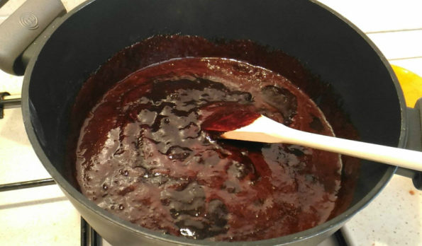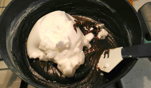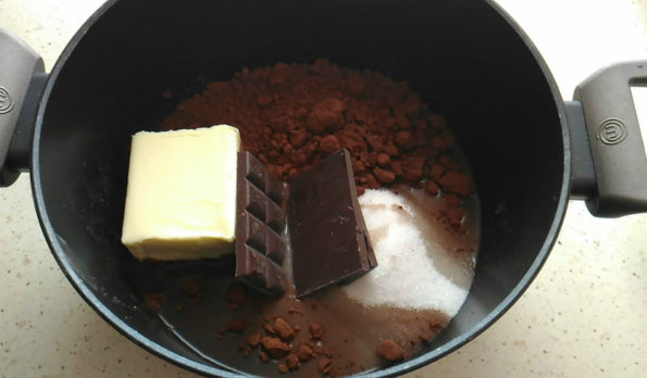 In una pentola versiamo l’acqua, lo zucchero, il burro o la margarina a seconda di quello che più vi piace, il cacao e la cioccolata fondente.