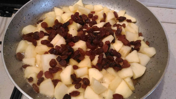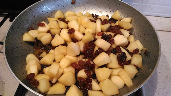 Aggiungete l’uvetta, non serve strizzarle, il liquore evaporerà vista la poca quantità.