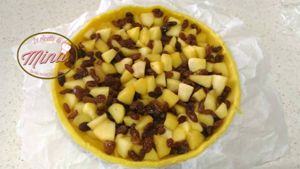 Versate il ripieno di mele e uvetta e stendiamo la rimanente frolla per la copertura.