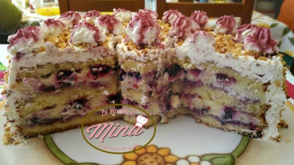 Circa 2,5 kg. di torta per 25 porzioni abbondanti, ecco la mia Torta di compleanno ai frutti di bosco. Ricetta con foto passo passo per realizzarla.