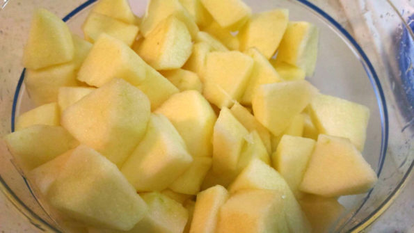Nel frattempo sbucciamo le mele e le facciamo a pezzi grossi, con uno spicchio 3 tocchi.