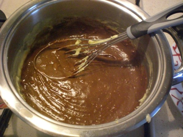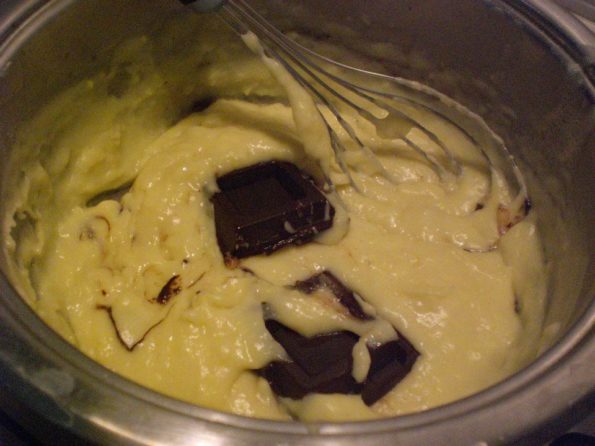 Ora che è pronta ne mettiamo da parte la metà in questo piatto, e la restante la lasciamo in pentola ci buttiamo dentro la cioccolata fondente sminuzzata, la facciamo sciogliere.