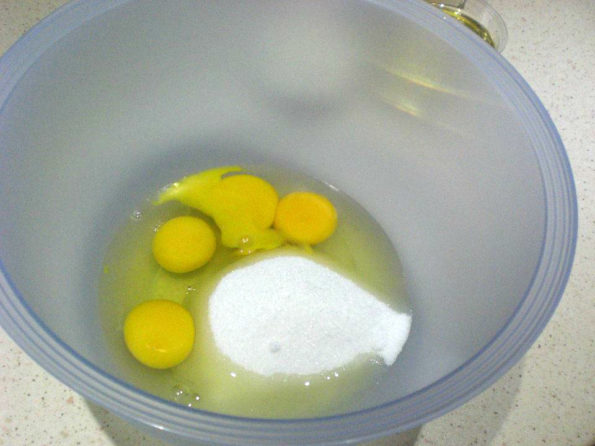 Prepariamo la base della Torta nua alla crema e cioccolata sbattendo le uova per intero con lo zucchero.