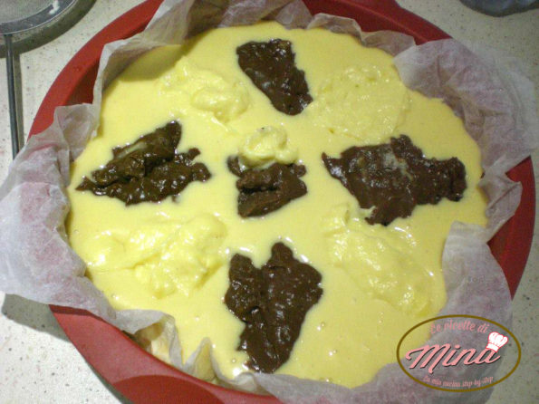 Versate la base della Torta nua alla crema e cioccolata in uno stampo da 28 cm.
