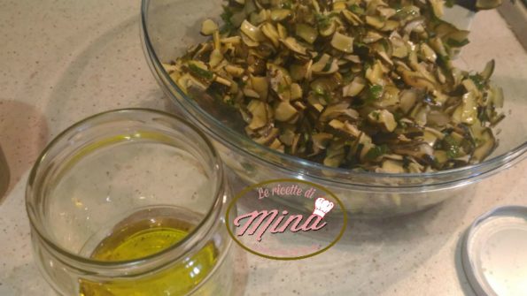 Aggiungo abbondante olio e una volta che sono certa che tutti i pezzettini siano ben unti inizio ad invasare.
