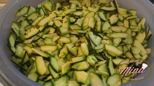 Una volta fatto il lavoro mettiamo i pezzettini di zucchina in un colino e aggiungiamo del sale che avremo cura di amalgamare a tutte le zucchine.